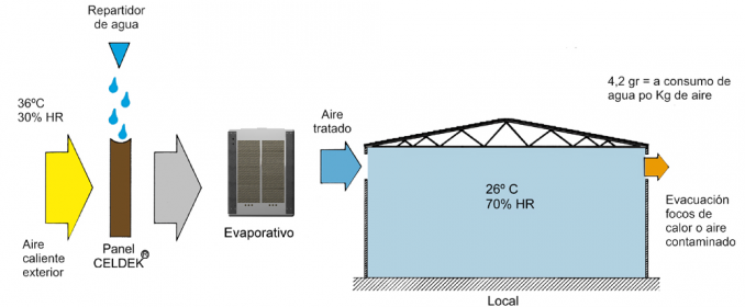 Un determinado caudal de aire a 36ºC y un 30% de humedad relativa es pasado a baja velocidad por el interior de un panel (CELdek) con una aportación de agua potable. El aire filtrado en el panel experimenta una bajada de temperatura y un incremento del grado de humedad con lo cuál ha pasado a una temperatura de 26ºC y un 70% de humedad relativa. Posteriormente este aire tratado es impulsado al local para climatizar su interior, pasando de una sensación de agobio a otra de bienestar y confort.